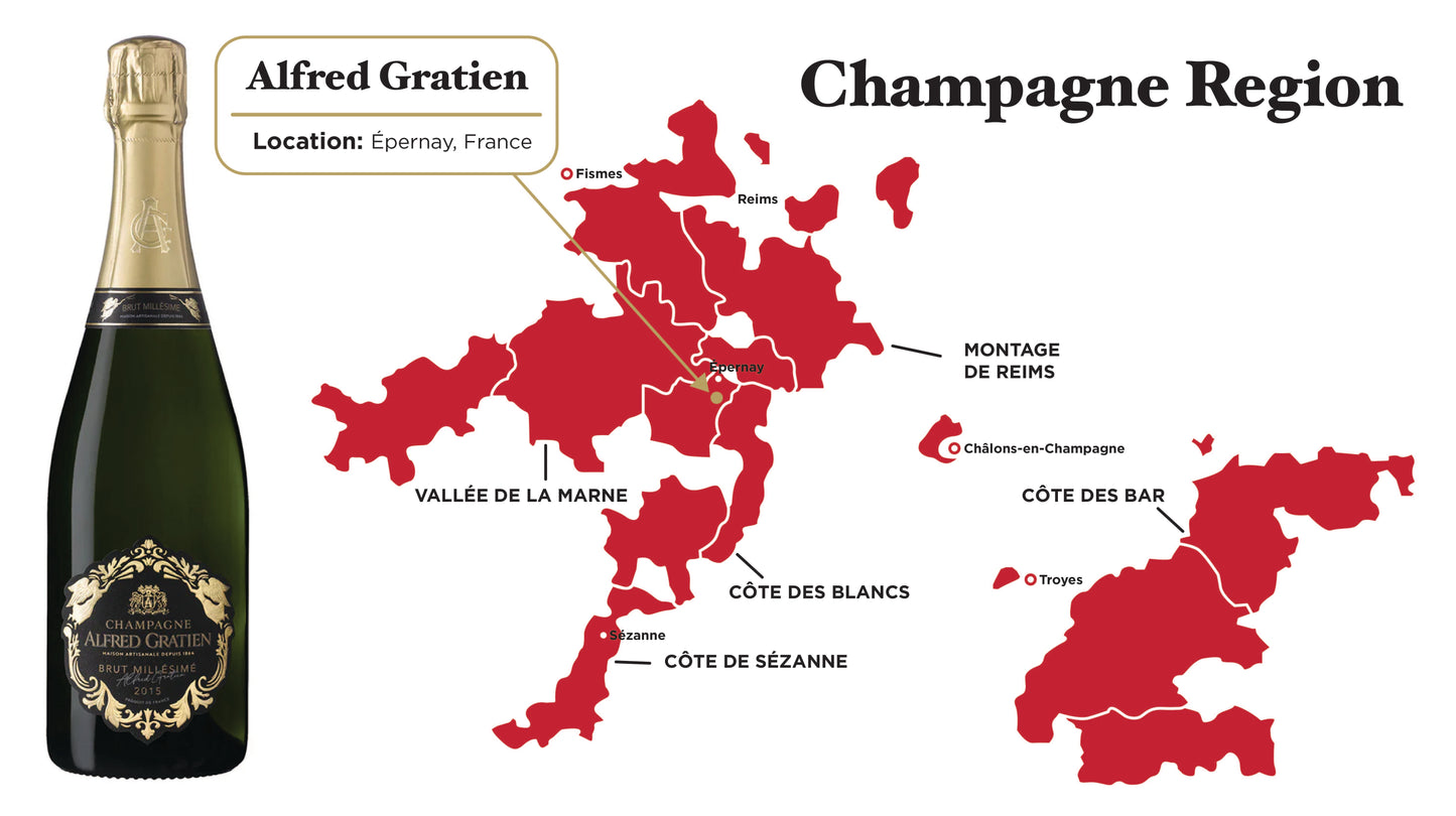 If exceptional had a name, it would be Champagne Alfred Gratien. Alfred Gratien champagnes are handcrafted for guaranteed quality and consistency. A few miles away from Épernay’s bustling town center, deep in the heart of a Champagne vineyard, are the Alfred Gratien champagne cellars. It was here, on Rue Maurice Cerveaux, that Alfred Gratien set up his business and created his first cuvées in 1864. For over a century and a half, Alfred Gratien champagnes have remained a family affair, perpetuated by the expertise and know-how of their founder. To this day, the house honours tradition with oak barrel vinification—a technique known as sous-bois—that imparts depth and complexity to every bottle.
